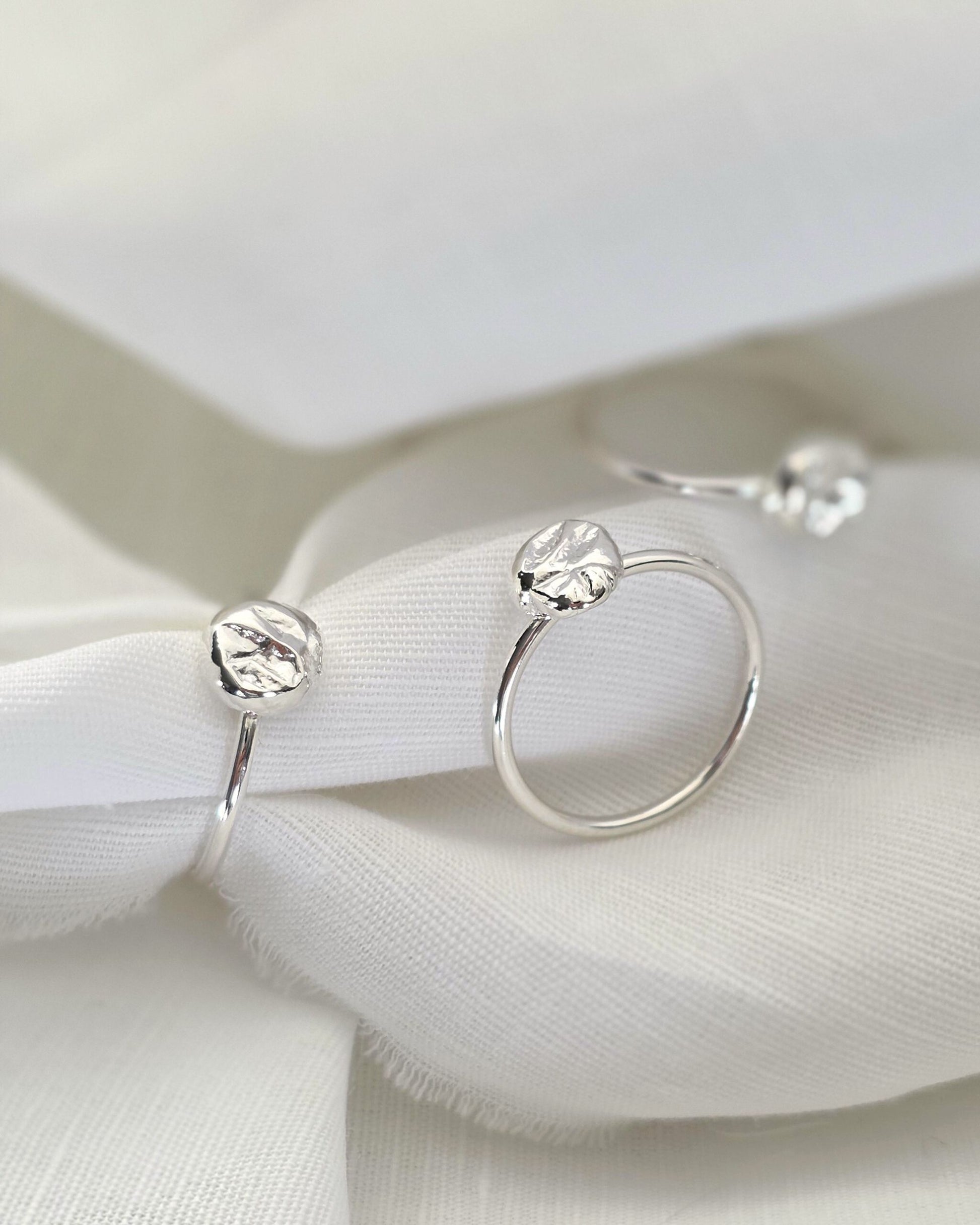 This simple yet striking ring features a gorgeous nugget created from molten sterling silver, soldered to a delicate silver band. The nugget’s organic surface ripples and dips in a way that catches the light beautifully.